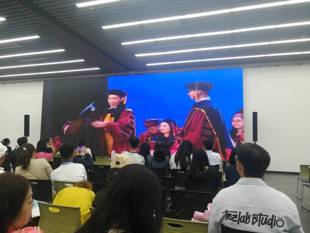 人数が多いため、私たちはメイン会場に入れませんでした。メイン会場に入れる親族は、生徒につき1人だけでしたので、お義母さんだけメイン会場に入りました。私たちは隣のサブ会場に行きました。サブ会場は1000人くらい入る広い会議室で、大きなスクリーンが3つあり、メイン会場の様子が生中継されていました。