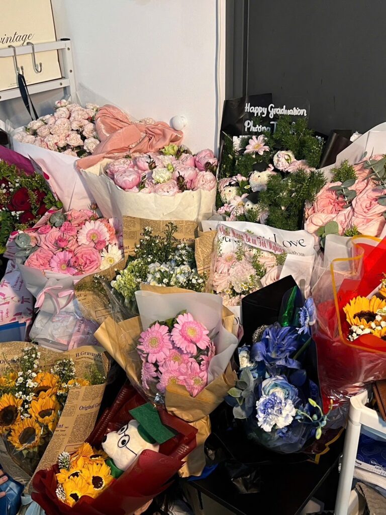 卒業証書の授与が終わった後、妹がサブ会場まで来てくれました。これで帰れるかなと思っていたところ、お祝いに駆け付けた友達との写真撮影が始まりました。少し待てば終わるだろうと思っていましたが、次から次へと友達が来ました。結局、1時間半ほど写真を撮っていました。ベトナム人は本当に写真が好きです。写真撮影が終わったあと、妹がもらった花束の量に驚愕しました。